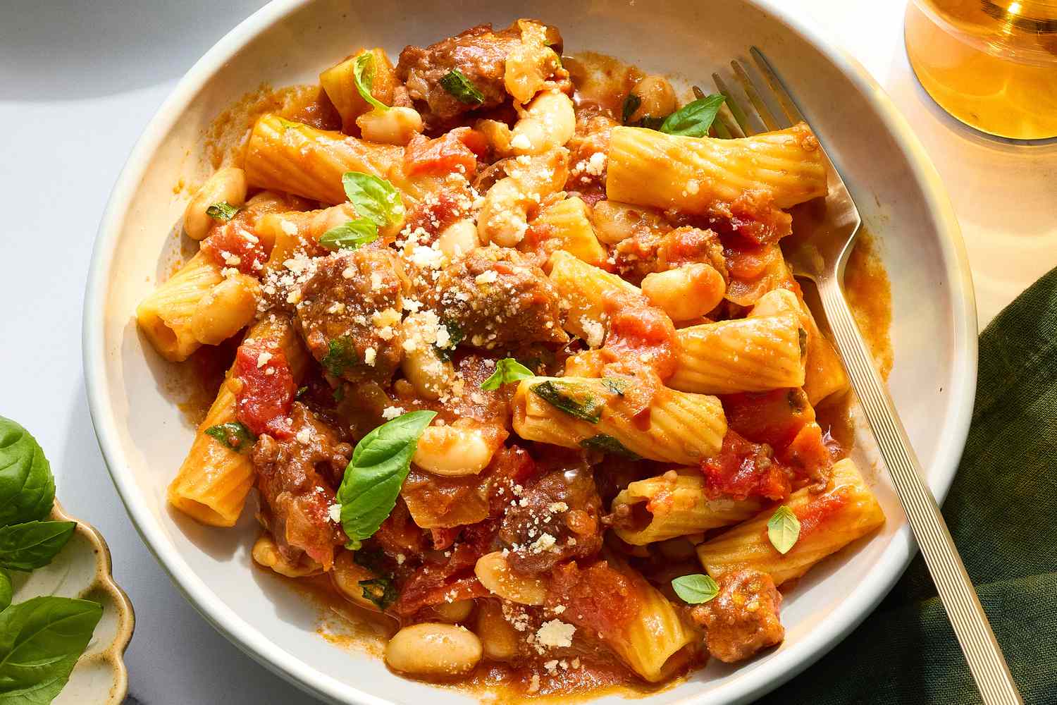 - हार्दिक, संतुलित पास्त्यासाठी रिगाटोनीला मसालेदार सॉसेज आणि कॅनेलिनी बीन्ससह टोमॅटो-आधारित सॉसमध्ये टाकले जाते.