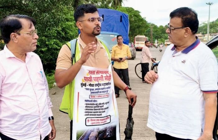 तब्बल 17 वर्षांहून अधिक काळापासूनअपूर्ण असलेल्या मुंबई-गोवा राष्ट्रीय महामार्गावरील (एनएच 66) अडथळे, रखडलेली कामे, जीवघेणे खड्डे, धोकादायक वळणे आणि अपघातप्रवण ठिकाणे यांचा प्रत्यक्ष अभ्यास करून शासनापर्यंत खरी वस्तूस्थिती पोहोचवण्यासाठी रायगड जिल्ह्यातील तरुण अभियंता चैतन्य पाटील (गाव कासू, पेण) यांनी एक आगळीवेगळी मोहीम (पदयात्रा) सुरू केली आहे. त्यांनी या मोहिमेला अर्थपूर्ण नाव दिलंय ‘रस्ता सत्याग्रह पायी पाहणी मोहीम’… ही यात्रा 9 ऑगस्ट रोजी पनवेल, पळस्पे फाटा येथून सुरू झाली असून रायगड-रत्नागिरीमार्गे सिंधुदुर्ग पर्यंत चालणार आहे. मंगळवारी चिपळूण येथे शिवसेना नेते आमदार भास्कर जाधव यांची भेट घेऊन चैतन्य यांनी पुढचा टप्पा संगमेश्वरच्या दिशेने सुरू केला. चैतन्याच्या या धाडसाचे भास्कर जाधव यांनी कौतुक करत त्यांच्या पाठीवर थाप देऊन ‘लढत राहा’ असा सल्ला दिला.