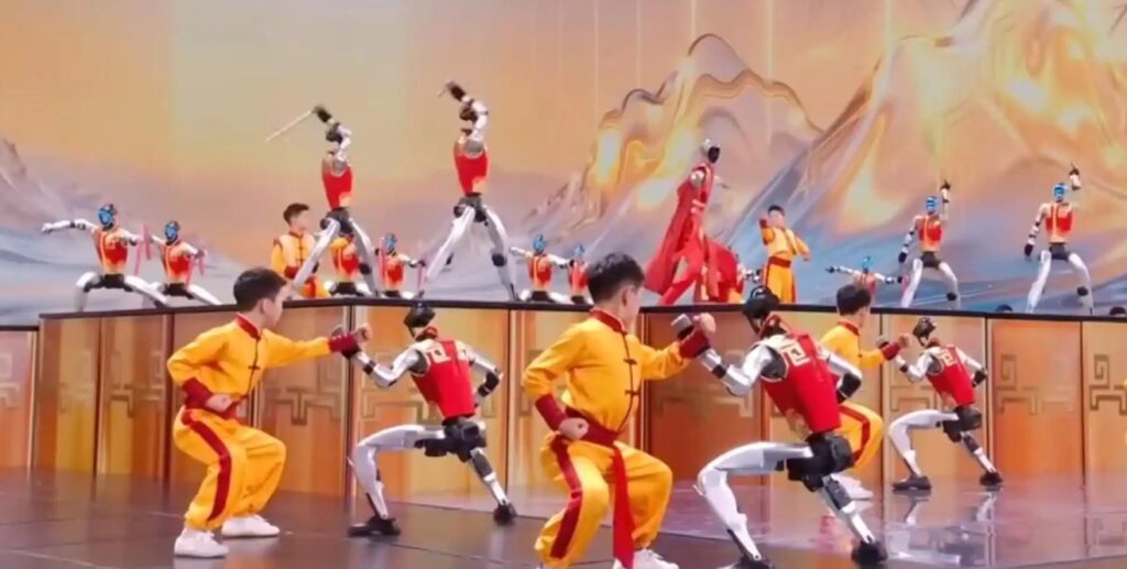 **युनिट्री रोबोटिक्स** वर्चस्व: त्यांच्या डझनभर कॉम्पॅक्ट **G1** ह्युमनॉइड रोबोट्सनी जगातील पहिले पूर्णपणे स्वायत्त क्लस्टर कुंग फू परफॉर्मन्स (“वूबोट” सेगमेंट) सादर केले, ज्यामध्ये वेगवान स्टॅन्स शिफ्ट, सिंक्रोनाइझ फॉर्मेशन्स, ड्रंकन बॉक्सिंग स्वर्व्ह, बॅकवर्ड टंबल्स, स्टॅबिलिटीसाठी रीपार्क, रीपार्क एलिमेंट्स. टेबल-वॉल्टिंग, 3m एरियल फ्लिप्स, एअरफ्लेअर स्पिन), आणि शस्त्रे हाताळणे (तलवारी, कर्मचारी, नंचक). त्यांनी मुलांच्या कुंग फू परफॉर्मर्सशी सुरक्षितपणे स्पर्धा केली, रिअल-टाइम मल्टी-रोबोट समन्वय, डायनॅमिक बॅलन्स, हाय-स्पीड फीडबॅक लूप आणि AI-चालित ऍडजस्टमेंट – मोशन लिमिट्स आणि क्लस्टर कंट्रोलमध्ये प्रशंसित उद्योग प्रथम.