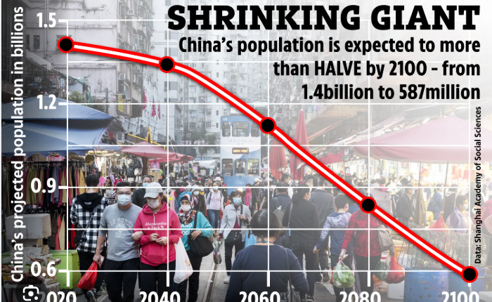 युनायटेड नेशन्सच्या अंदाजानुसार चीनची लोकसंख्या आज सुमारे 1.4 अब्ज वरून 2100 पर्यंत सुमारे 800 दशलक्ष इतकी कमी होऊ शकते, काही अंदाजानुसार शतकाच्या अखेरीस तिची निम्म्याहून अधिक लोकसंख्या कमी होईल.