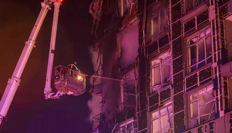कीव, युक्रेन येथे मंगळवारी झालेल्या रशियन हल्ल्यानंतर आपत्कालीन सेवा कर्मचारी आग विझवण्याचे काम करत आहेत. फोटो: एपी/पीटीआय
