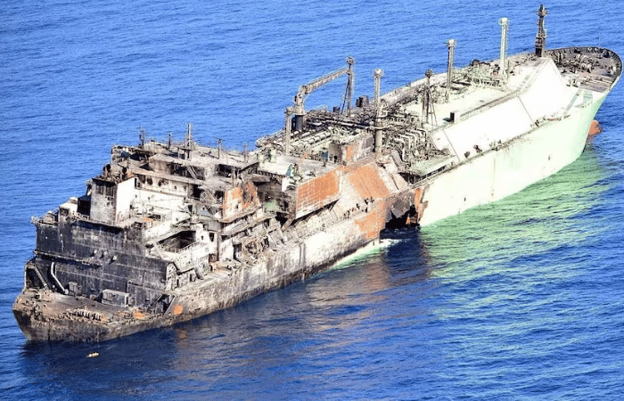 हेलिकॉप्टरमधून घेतलेल्या दृश्यात या जहाजाचा एक भाग काळा पडला असून एका बाजूला कललेला दिसत आहे. जहाजाच्या डाव्या बाजूला एक मोठे छिद्रही दिसत आहे. त्याच्या सभोवताली पाण्यात एक पातळ थर दिसत असून, त्यामुळे प्रदूषणाची चिंता वाढली आहे.