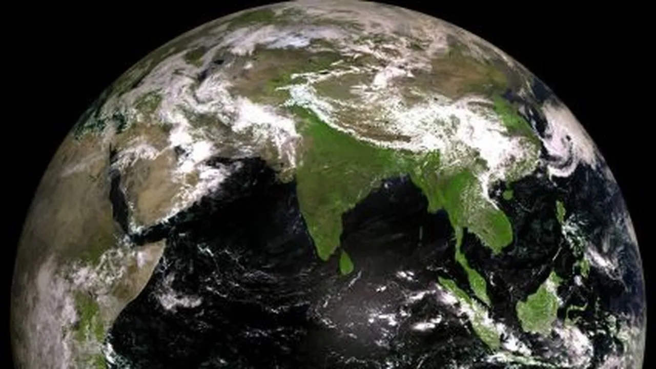 रशियाच्या इलेक्ट्रो-एल उपग्रहाने कॅप्चर केलेले पृथ्वीचे संपूर्ण दृश्य, मध्यभागी भारतीय उपखंड, खाली स्पष्टपणे दिसणारे श्रीलंका आणि सर्वत्र हिंद महासागराचे गडद, ​​निळे पाणी.