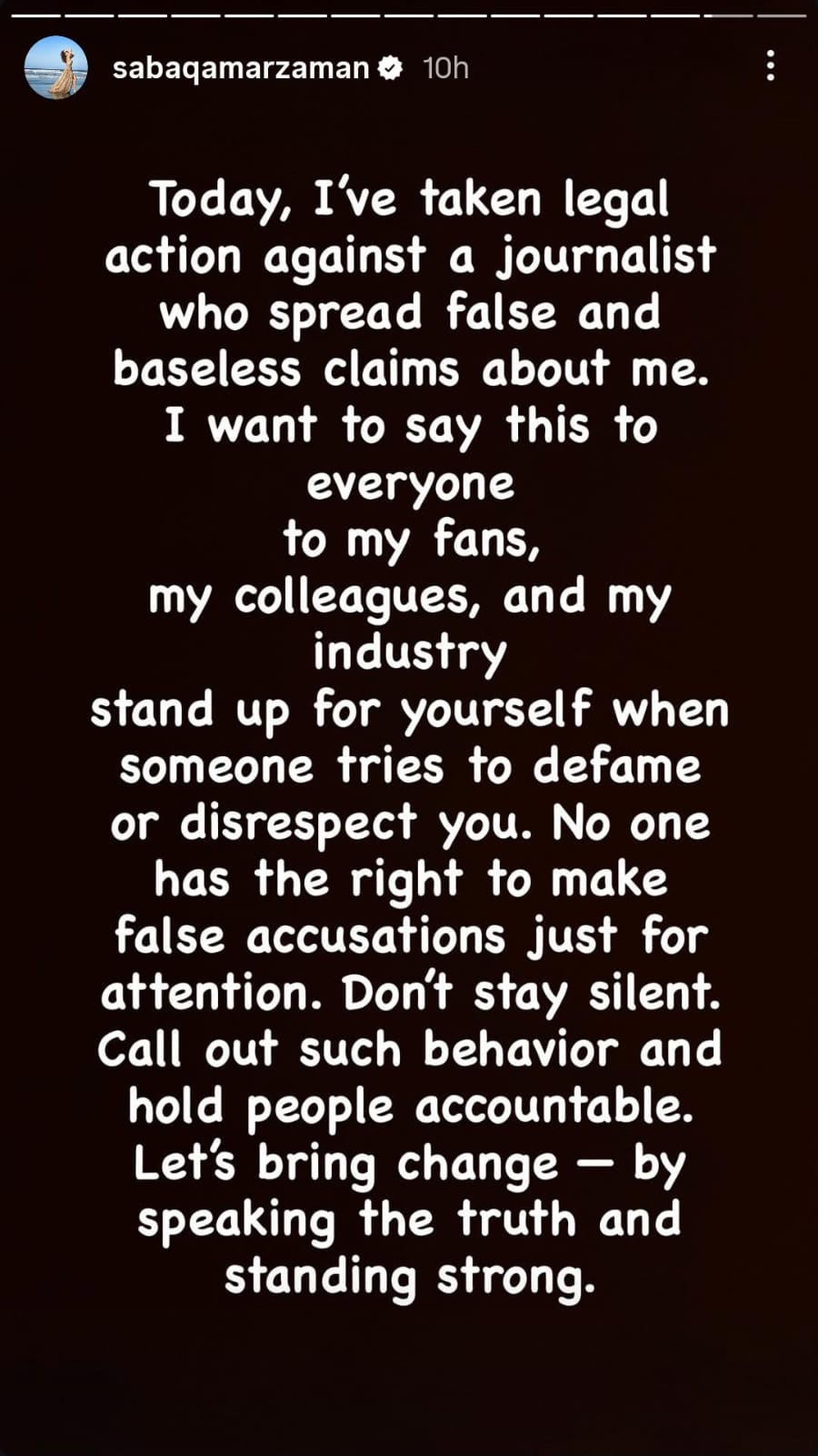 तिच्या विधानासह बाहेर आल्यानंतर, सबा कमरने तिच्या वकिलांच्या माध्यमातून पत्रकार आणि संबंधित यूट्यूब चॅनेलवर कायदेशीर नोटीस बजावली आणि त्यांना सात दिवसांच्या आत सार्वजनिक माफी मागावी आणि त्यांच्या संबंधित प्लॅटफॉर्मवरून सर्व “बनावकारक सामग्री” काढून टाकण्यास सांगितले.