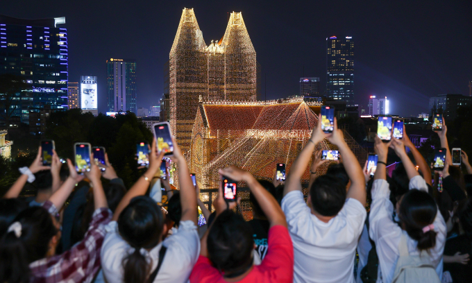 सायगॉन नोट्रे-डेम कॅथेड्रलचे रात्रीच्या वेळी ख्रिसमसच्या तमाशात रूपांतर झाल्याने शेकडो रूग्ण प्रेक्षकांना आकर्षित केले, ज्यांनी 1,000 किलोमीटरहून अधिक चमकदार LED दिवे प्रज्वलित केलेले लँडमार्क पाहण्यासाठी सुमारे एक तास प्रतीक्षा केली.