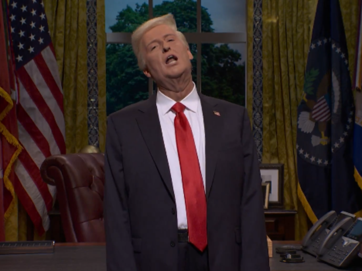 “सॅटर्डे नाईट लाइव्ह” ने आपला नवीनतम भाग ओव्हल ऑफिसमध्ये ओव्हल ऑफिसमध्ये कोसळल्याबद्दल राष्ट्राध्यक्ष डोनाल्ड ट्रम्प यांच्या प्रतिक्रियेच्या विडंबनासह उघडला. ट्रम्प स्थिर उभे राहून माणूस पडताना पाहिल्यानंतर वास्तविक जीवनातील क्षणाकडे लक्ष वेधले गेले. स्केचमध्ये, अभिनेता जेम्स ऑस्टिन जॉन्सनने ट्रम्पच्या भूमिकेची पुनरावृत्ती केली, मजल्यावरील कर्मचाऱ्यांना मदत करण्यासाठी काहीही न करता विनोदी भाष्य केले.