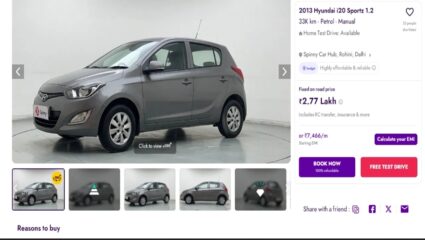 Spinny वरील सूचीनुसार, Hyundai i20 Sportz 1.2 (2013) मॉडेल फक्त 2.77 लाख रुपयांना उपलब्ध आहे.
