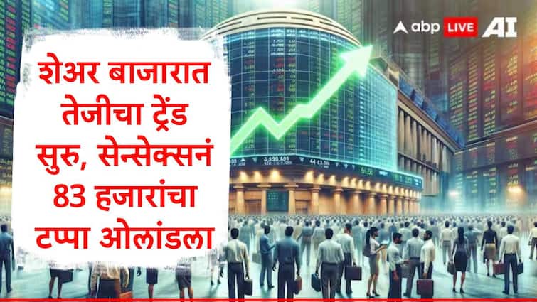 आशियाई बाजारातील तेजीमुळं भारतीय शेअर बाजारात जोरदार तेजी पाहायला मिळाली. डॉलरच्या तुलनेत रुपया मजबूत झाल्यानं आणि ब्रॉडर मार्केटमध्ये खरेदी झाल्यानं निफ्टी 50 आणि सेन्सेक्समध्ये 1 टक्के तेजी दिसून आली. बॉम्बे स्टॉक एक्सचेंजवर सेन्सेक्स आज 862.23 अंकांच्या तेजीसह बंद झाला. आज सेन्सेक्सनं 83 हजारांचा टप्पा पार केला आहे.. सेन्सेक्सनं आज 83615.48 अंकांचा उच्चांक गाठला होता. आज बाजार बंद झाला तेव्हा सेन्सेक्स 83467.66 अंकांवर बंद झाला. तर, निफ्टी 50 मध्ये देखील 261.75 अंकांची तेजी पाहायला मिळाली. आज बाजार बंद झाला तेव्हा निफ्टी 50 निर्देशांक 25585.30 अंकांवर बंद झाला.