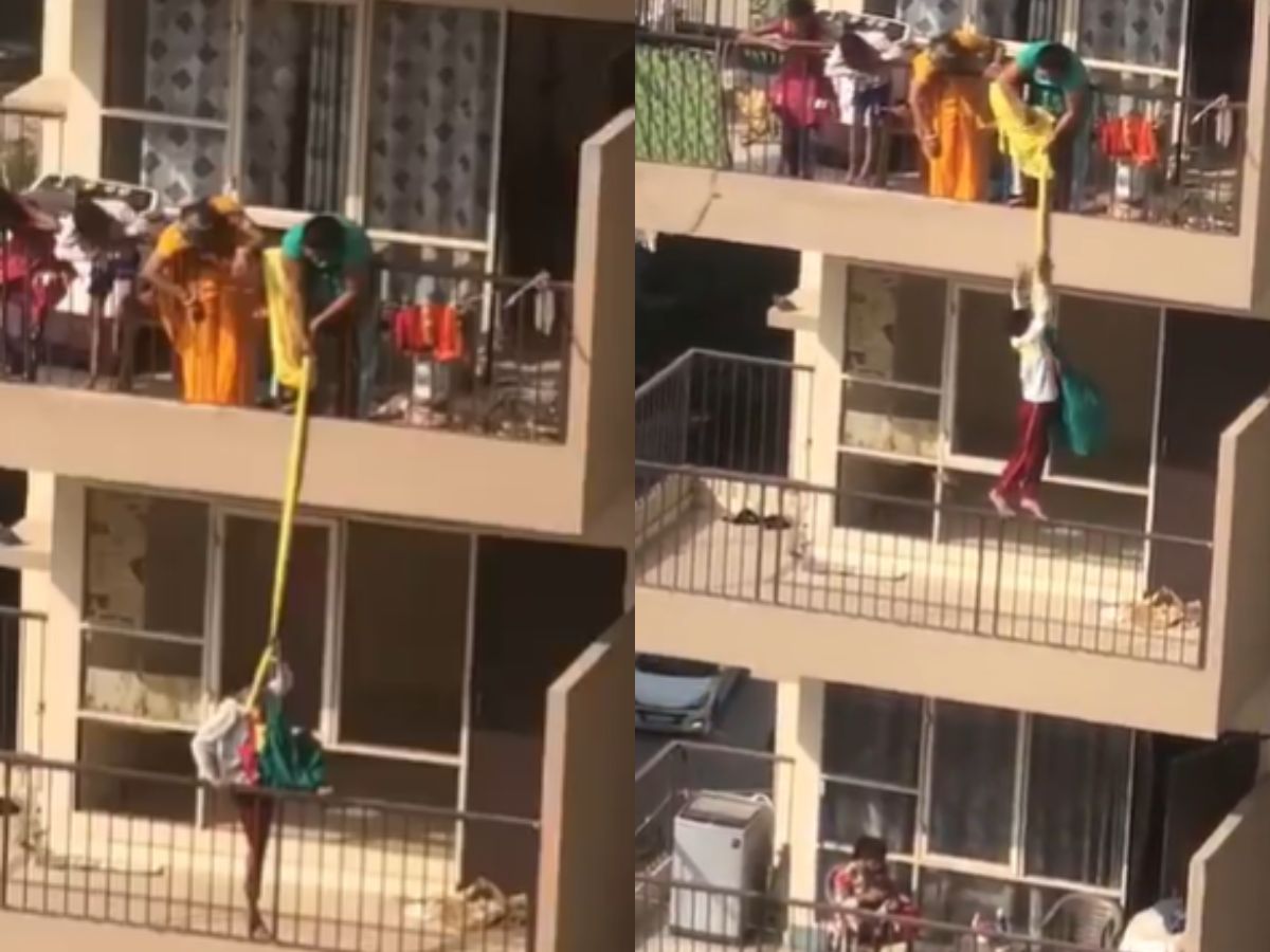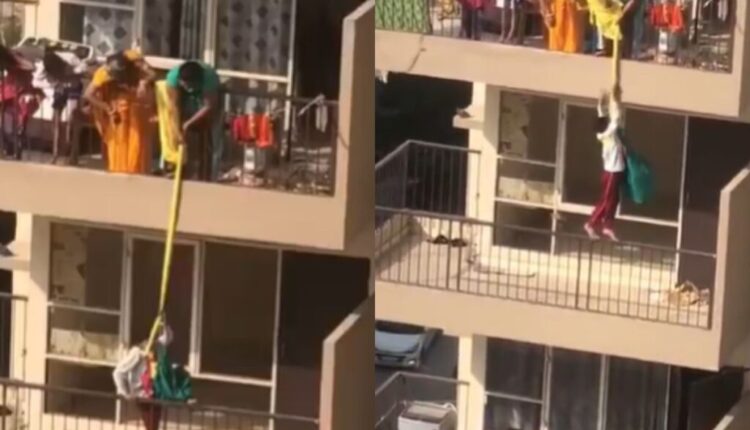 धक्कादायक कृत्य कॅमेऱ्यात कैद: चौथ्या मजल्यावरील महिलेने तिच्या मुलाला वरच्या मजल्यावरील बाल्कनीतून साडी बांधून कपडे धुण्यासाठी खाली आणले, नेटिझन्सने बेजबाबदार पालकत्वाच्या कायद्याची निंदा केली