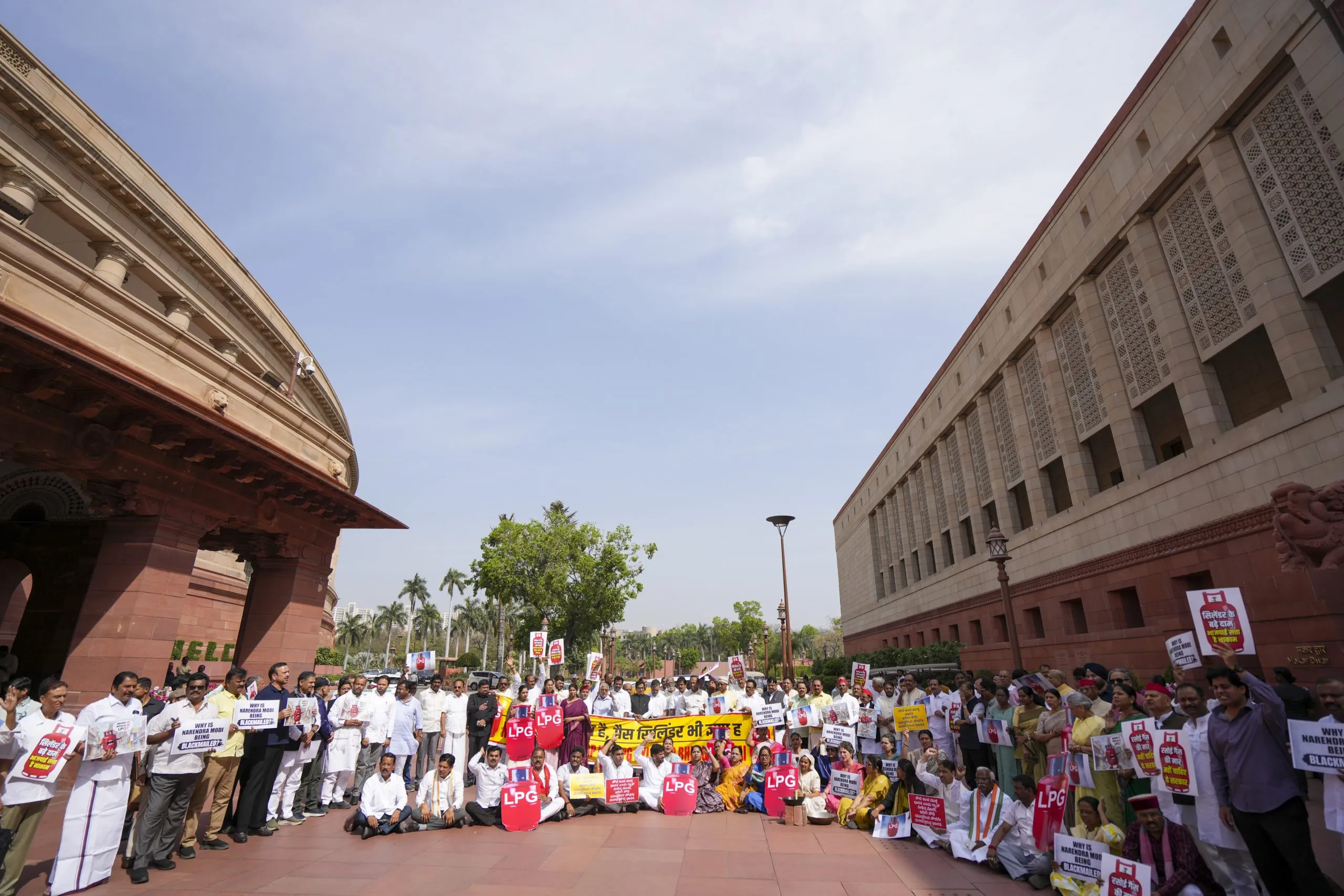 गॅस टंचाईवर संसदेबाहेर घोषणाबाजी