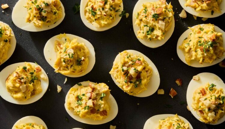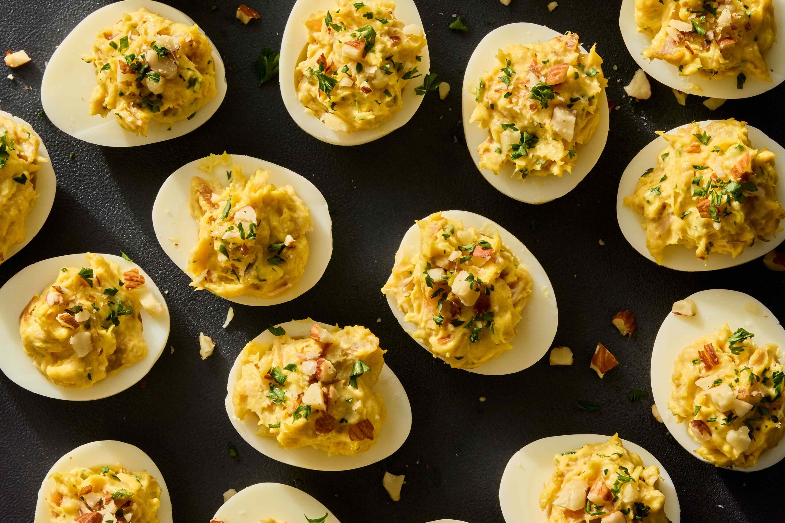 क्लासिक डेव्हिल अंडी वर एक चवदार पिळणे, ही आवृत्ती एकत्रित करते स्मोकी ट्राउट, उबदार करी मसाला आणि ताजी औषधी वनस्पतीअतिरिक्त पोत साठी एक कुरकुरीत खारट बदाम टॉपिंग सह समाप्त.
