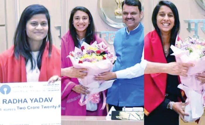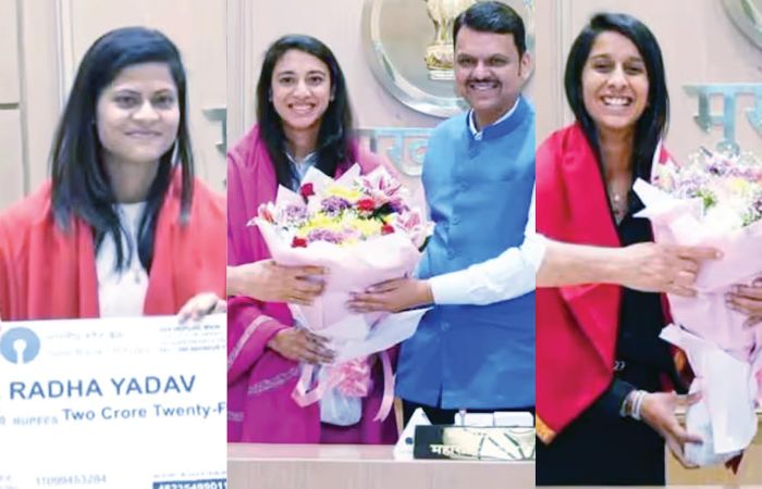 आयसीसी महिला क्रिकेट विश्वचषक जिंकणाऱ्या हिंदुस्थानी संघातील महाराष्ट्राच्या खेळाडू उपकर्णधार स्मृती मानधना, जेमिमा रॉड्रिग्ज आणि राधा यादव यांचा आज मुख्यमंत्री देवेंद्र फडणवीस यांच्या हस्ते वर्षा निवासस्थानी सत्कार करण्यात आला. तिघींनाही बक्षीस म्हणून प्रत्येकी सवा दोन कोटी रुपयांचा धनादेश देण्यात आला.