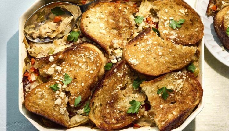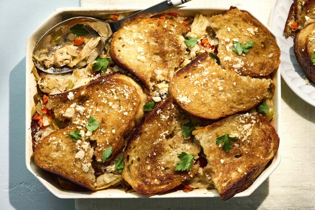 सोपा कोडा (चिकन आणि ब्रेड कॅसरोल) — एक अडाणी व्हेनेशियन डिश ज्यामध्ये टोस्टेड ब्रेड, कोमल चिकन आणि चीज मटनाचा रस्सा, आरामदायी बेकमध्ये थर ठेवतात.