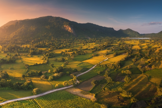 दक्षिण व्हिएतनाममधील ता पा व्हॅली कापणीच्या हंगामात जिवंत होते, शुगर पाम्स आणि ख्मेर मंदिरांसोबत पहाटेच्या वेळी भाताची शेते चमकतात.
