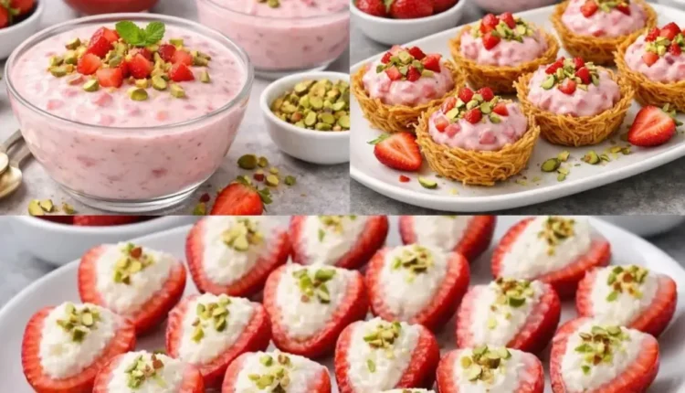 स्ट्रॉबेरी रबरी कुरकुरीत शेवई बास्केटमध्ये सर्व्ह केली जाते, ज्यामध्ये चिरलेली स्ट्रॉबेरी आणि पिस्ते असतात.