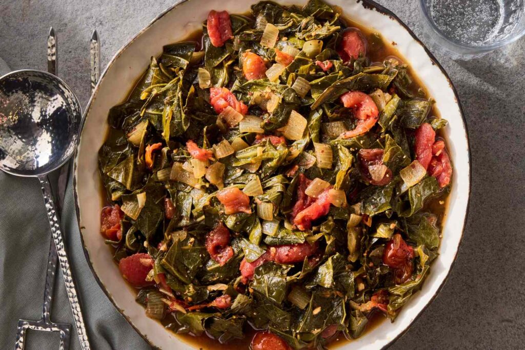 - कोलार्ड हिरव्या भाज्या स्मोकी डुकराच्या स्टॉकमध्ये शिजवल्या जातात, नंतर कांदे, लसूण, ठेचलेली लाल मिरची आणि टोमॅटोसह एक खोल चवदार दक्षिणी शैलीसाठी एकत्र केले जातात.