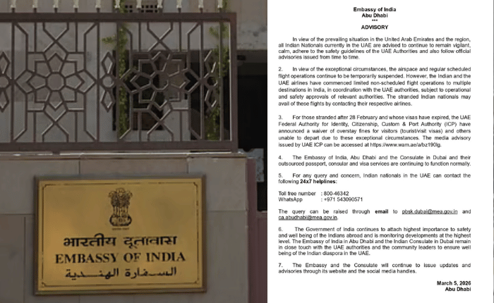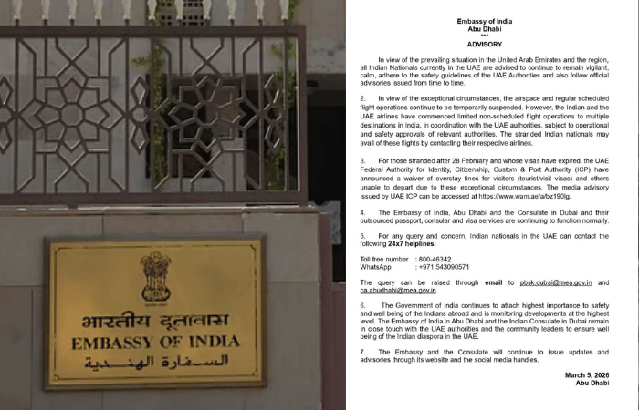 कोणत्याही प्रश्नांसाठी आणि चिंतेसाठी, UAE मधील भारतीय नागरिक खालील २४x७ हेल्पलाइनवर संपर्क साधू शकतात. त्यासाठी टोल फ्री क्रमांक: ८००-४६३४२, व्हॉट्सअॅप: ९७१ ५४३०९०५७१, [email protected] आणि [email protected] या ईमेल पत्त्यांवर प्रश्न विचारता येतील. भारत सरकार परदेशात असलेल्या भारतीयांच्या सुरक्षिततेला आणि आरोग्याला सर्वोच्च महत्त्व देत आहे आणि उच्च स्तरावर घडामोडींवर लक्ष ठेवून आहे. अबू धाबी येथील भारतीय दूतावास आणि दुबईतील भारतीय वाणिज्य दूतावास UAE अधिकाऱ्यांशी संपर्क साधत आहेत. दूतावास आणि वाणिज्य दूतावास त्यांच्या वेबसाइट आणि सोशल मीडिया हँडलद्वारे अपडेट्स आणि सूचना जारी करत राहतील, असे मार्गदर्शक सूचनांमध्ये स्पष्ट करण्यात आले आहे.