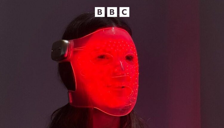 (इमेज: LED फेस मास्क घातलेल्या शिओना मॅकॅकलमचा फोटो. खोलीत अंधार आहे आणि पारदर्शक फेस मास्क शिओनाचा चेहरा झाकतो. मास्कमधून निघणारा प्रकाश शिओनाच्या चेहऱ्याला लाल चमक देतो. क्रेडिट: BBC.)