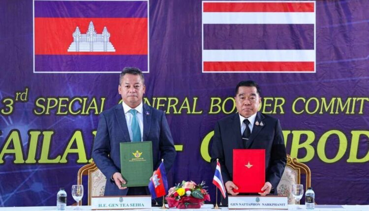 कंबोडियाचे संरक्षण मंत्री टी सेहा, डावीकडे, थायलंडच्या चांथाबुरी प्रांतातील जनरल बॉर्डर कमिटीच्या बैठकीत थायलंडचे संरक्षण मंत्री नत्थाफोन नार्कफनिट यांच्यासोबत उजवीकडे उभे आहेत.