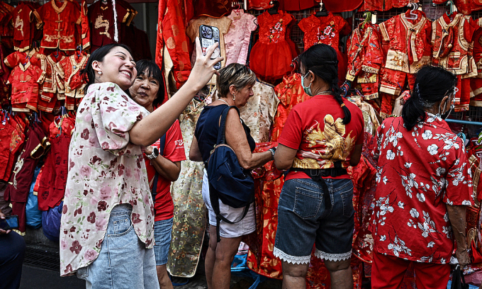 सापाच्या चंद्र नवीन वर्षाच्या पहिल्या दिवशी 29 जानेवारी 2025 रोजी बँकॉकच्या चायनाटाउन जिल्ह्यात लाल चिनी शैलीतील कपडे विकणाऱ्या स्टॉलवर लोक फोटो काढतात. एएफपी द्वारे छायाचित्र |