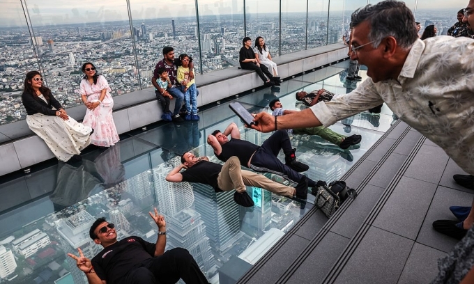15 मे 2025 रोजी बँकॉक, थायलंड येथील महानखॉन इमारतीत महानखॉन स्कायवॉक रूफटॉपचा आनंद घेताना लोक पोज देतात. रॉयटर्सचा फोटो