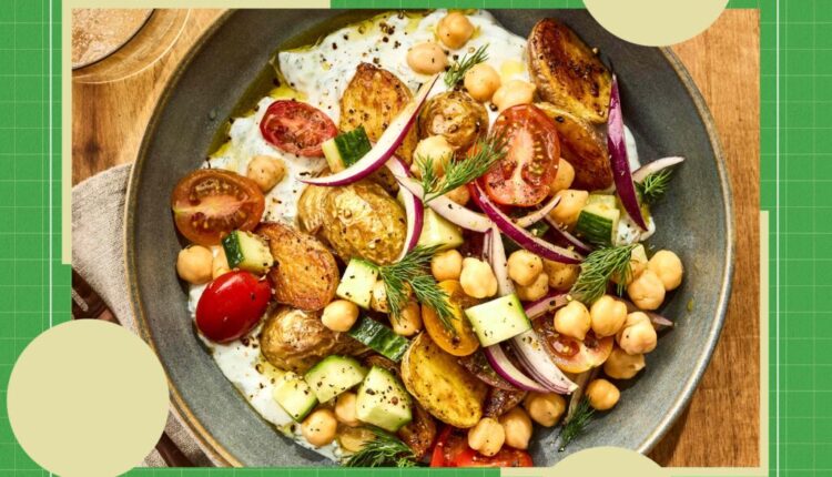 सोप्या बद्दल बोलायचे तर, ही रेसिपी असे नमूद करते की ते बनवण्यासाठी एकूण 45 मिनिटे लागतात, परंतु व्यस्त काम बहुतेक फक्त भाज्या तोडणे आणि त्झात्झीकी मिसळणे आहे. एकदा तुम्ही सर्वकाही तयार केल्यावर, ते सोपे आहे: वाडग्याचा आधार त्झात्झिकी आहे, नंतर तुमच्या चणा आणि भाज्यांसह शीर्षस्थानी ठेवा, तुमचे भाजलेले बटाटे घाला आणि काही खरोखर चांगले ऑलिव्ह ऑइलसह रिमझिम करा. व्यक्तिशः, मी प्रेम केले आहे कनान पॅलेस्टाईनचे रूमी ऑलिव्ह ऑइल अलीकडे त्याच्या ठळक चवसाठी, आणि हे आश्चर्यकारकपणे सर्व-उद्देशीय आहे, म्हणून मी ते बटाटे तसेच फिनिशिंगसाठी वापरू शकतो.