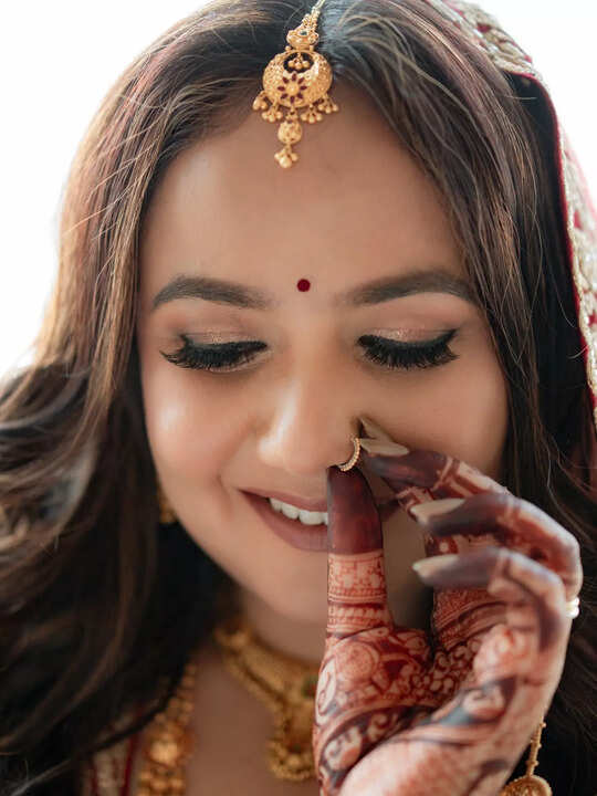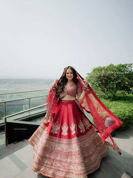 'सपने सुहाने लडकपन के' मधील गुंजनच्या भूमिकेसाठी प्रेक्षकांच्या पसंतीस उतरलेली रूपल त्यागी तिच्या वधूच्या लूकमध्ये शाही नववधूसारखी दिसत होती. तिने लग्नासाठी लाल रंगाचा पारंपारिक लेहेंगा निवडला, जो सुंदर हातकामाने सजलेला होता. यासोबतच हेवी ज्वेलरी आणि क्लासिक मेकअपमुळे तिची संपूर्ण वधू अतिशय शोभिवंत दिसत होती. वर नोमिश भारद्वाज देखील क्रीम-गोल्ड शेरवानीमध्ये खूपच सुंदर दिसत होता.