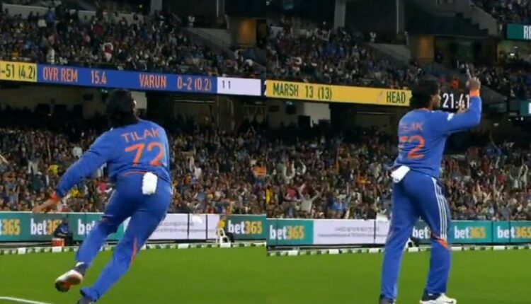 भारत आणि ऑस्ट्रेलिया (IND vs AUS) यांच्यातील 5 सामन्यांच्या टी-20 मालिकेतील दुसरा सामना मेलबर्नमध्ये खेळला गेला. या सामन्यात अभिषेक शर्माला (Abhishek Sharma) वगळता कोणताही भारतीय फलंदाज विशेष चमक दाखवू शकला नाही. टीम इंडियाने (Team india) मोठा स्कोर उभारण्यात अपयश आले. मात्र, क्षेत्ररक्षणादरम्यान तिलक वर्माने (Tilak Verma) अप्रतिम झेल घेऊन सगळ्यांचे लक्ष वेधून घेतले. त्याच्या त्या जबरदस्त कॅचनं चाहत्यांना कौतुकाचा वर्षाव करायला भाग पाडलं.