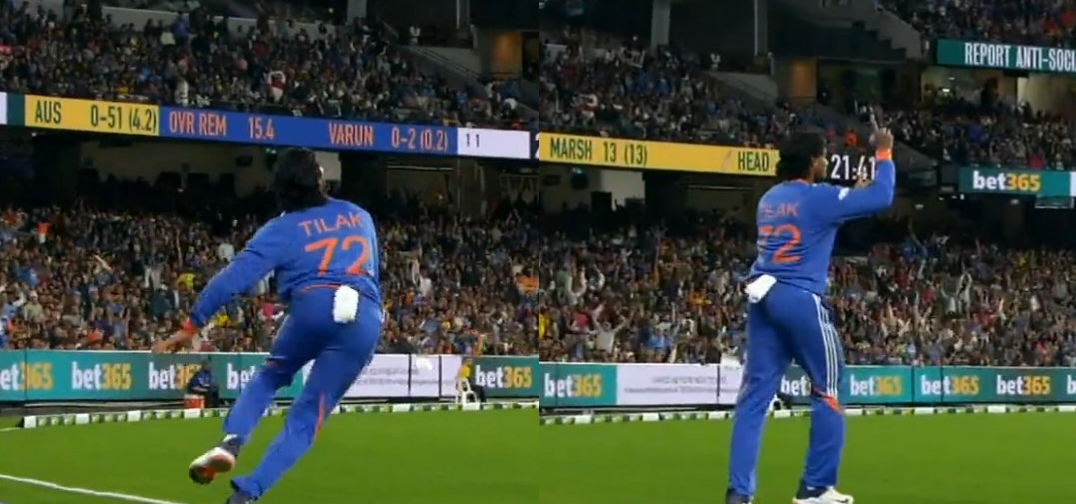 भारत आणि ऑस्ट्रेलिया (IND vs AUS) यांच्यातील 5 सामन्यांच्या टी-20 मालिकेतील दुसरा सामना मेलबर्नमध्ये खेळला गेला. या सामन्यात अभिषेक शर्माला (Abhishek Sharma) वगळता कोणताही भारतीय फलंदाज विशेष चमक दाखवू शकला नाही. टीम इंडियाने (Team india) मोठा स्कोर उभारण्यात अपयश आले. मात्र, क्षेत्ररक्षणादरम्यान तिलक वर्माने (Tilak Verma) अप्रतिम झेल घेऊन सगळ्यांचे लक्ष वेधून घेतले. त्याच्या त्या जबरदस्त कॅचनं चाहत्यांना कौतुकाचा वर्षाव करायला भाग पाडलं.