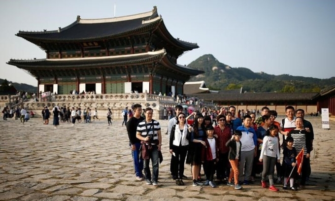 5 ऑक्टो. 2016, दक्षिण कोरियाच्या सेंट्रल सेऊलमधील ग्योंगबोक पॅलेसमध्ये पर्यटक ग्रुप फोटोसाठी पोझ देतात. रॉयटर्सचा फोटो