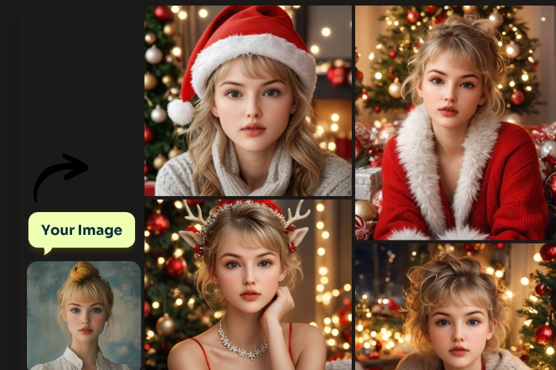 अचूक चेहऱ्याची वैशिष्ट्ये, त्वचेचा टोन आणि हावभाव राखून अपलोड केलेल्या सेल्फींना खऱ्या-टू-लाइफ हॉलिडे पोर्ट्रेटमध्ये रूपांतरित करण्यात ही टूल्स पारंगत आहेत. तुमचा फोटो अपलोड करा आणि उत्तम परिणामांसाठी यापैकी एक सूचना जोडा (किंवा तुमच्या गरजेनुसार बदला).