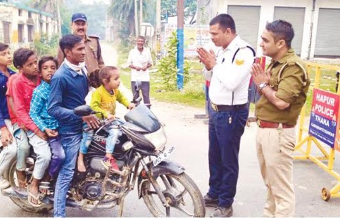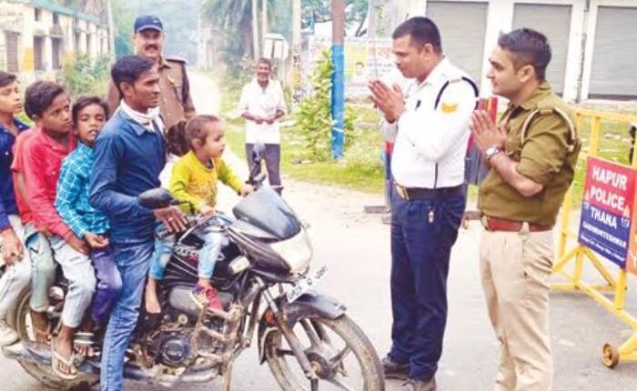 वाहतुकीचे नियम मोडले की, वाहतूक पोलीस कारवाई करणारच. पण, अनेकदा वाहनचालक अशा प्रकारे नियम मोडतात की, पोलीसदेखील त्यांच्यासमोर हात जोडतात. सोशल मीडियावर एक वाहनचालकाचा फोटो व्हायरल झाला आहे. त्यात एक जण तब्बल 6 मुलांना बसवून मोटरसायकल चालवीत होता. उत्तर प्रदेशातील हापूर येथील हा फोटो असल्याचे सोशल मीडिया पोस्टमध्ये म्हटले आहे. चार मुले चालकाच्या मागे, तर 2 मुले समोर पेट्रोलच्या टाकीवर बसलेले दिसतात. वाहतूक पोलिसाने त्याला थांबविले आणि हात जोडून त्याला गांभीर्य समजविले. त्यासोबतच त्याला 7 हजार रुपयांचा दंडदेखील ठोठावला. ‘एक्स’ या सोशल मीडियावरील @bstvlive या खात्यावरून हा फोटो शेअर करण्यात आला आहे.