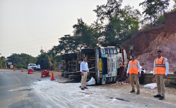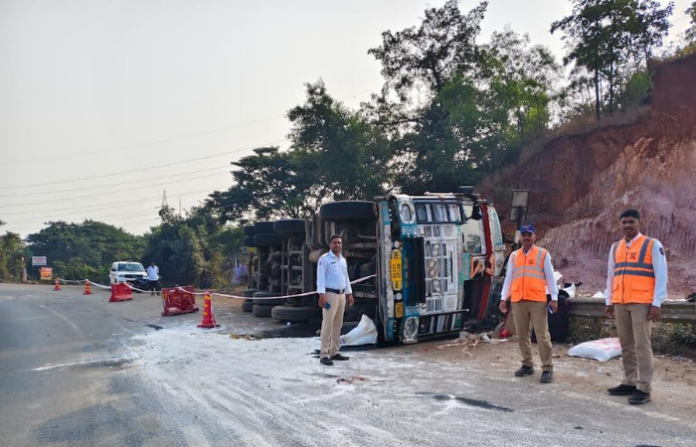 मुंबई-गोवा महामार्गावरील हळवल येथे ट्रक पलटी होवून अपघात, वाहतूक काही काळ विस्कळीत