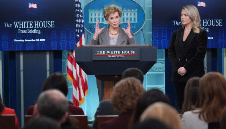 शिक्षण सचिव लिंडा मॅकमोहन, डावीकडे, व्हाईट हाऊसच्या प्रेस सेक्रेटरी कॅरोलिन लेविट वॉशिंग्टनमध्ये गुरुवारी, 20 नोव्हेंबर 2025 रोजी व्हाईट हाऊसमधील जेम्स ब्रॅडी प्रेस ब्रीफिंग रूममध्ये पत्रकारांशी बोलत असताना दिसत आहेत. (एपी फोटो/ॲलेक्स ब्रँडन)
