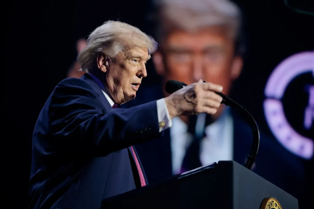 ट्रम्प: होर्मुझच्या सामुद्रधुनीवर इराण 'आम्हाला ब्लॅकमेल करू शकत नाही', 'वर्क आउट व्हेरी आउट' बोलतो. राष्ट्राध्यक्ष डोनाल्ड ट्रम्प 17 एप्रिल 2026 रोजी फिनिक्स, ऍरिझोना येथील ड्रीम सिटी चर्च येथे टर्निंग पॉइंट यूएसए कार्यक्रमास उपस्थित होते.