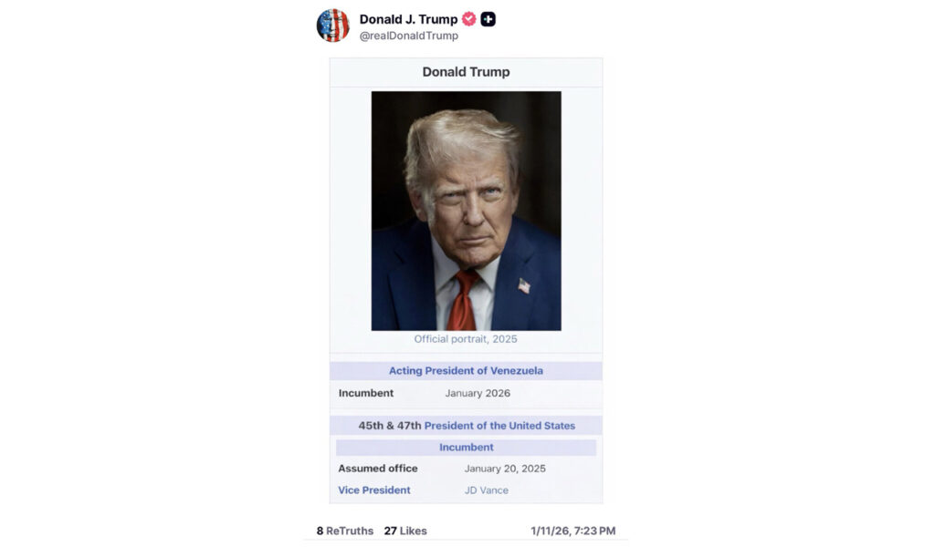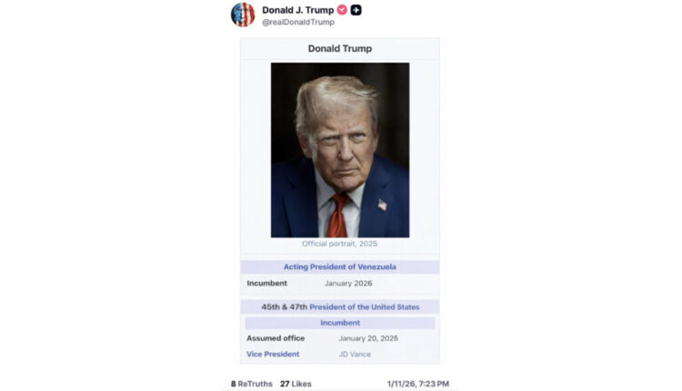 ट्रम्प यांनी स्वत:ला व्हेनेझुएलाचे कार्यवाहक अध्यक्ष म्हणवून घेतलेली प्रतिमा पोस्ट केली आहे