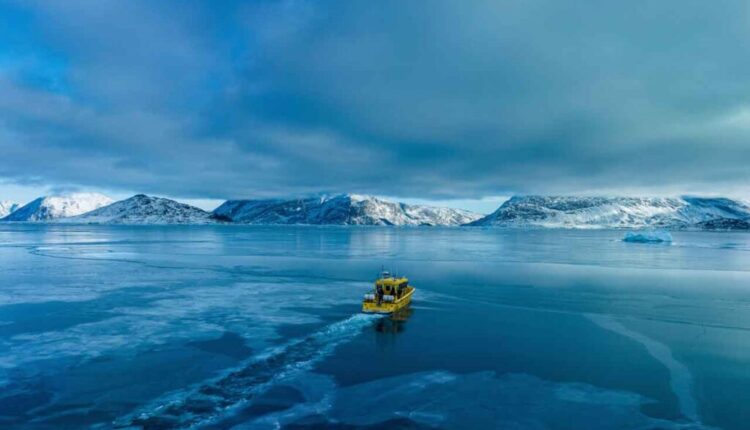 6 मार्च, 2025 रोजी ग्रीनलँडच्या नुकच्या बाहेर गोठलेल्या समुद्राच्या प्रवेशद्वारावर बोट चालवत आहे. फोटो: एपी