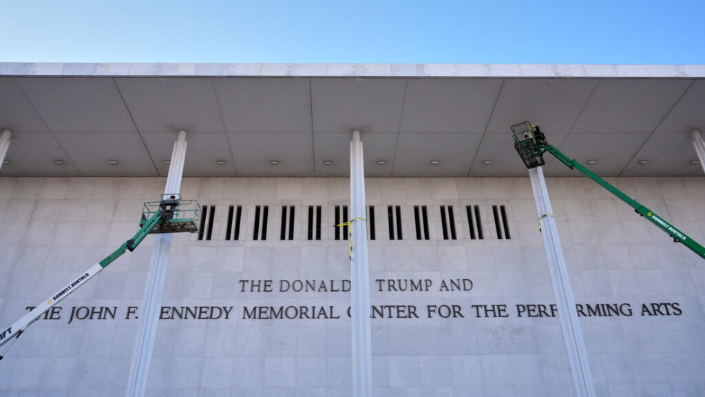 पुनर्ब्रँडिंगचा प्रयत्न लक्षात येण्याजोग्या तत्परतेने केला गेला. निळ्या टार्प्सने काम लपवून ठेवले कारण क्रूने प्रसिद्ध कला स्थळाबाहेरील चिन्ह बदलले. दिवसाच्या शेवटी, इमारतीला एक नवीन नाव मिळाले: डोनाल्ड जे. ट्रम्प आणि जॉन एफ. केनेडी मेमोरियल सेंटर फॉर द परफॉर्मिंग आर्ट्स.