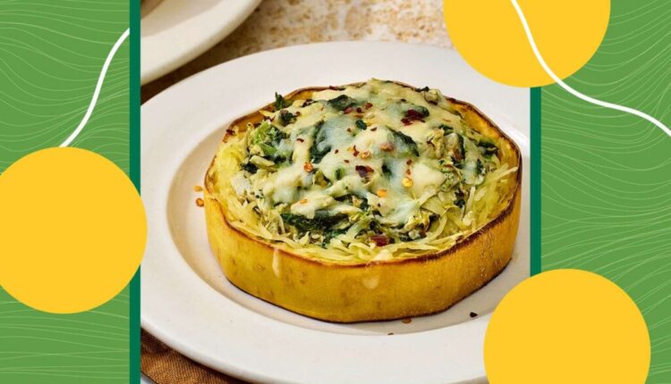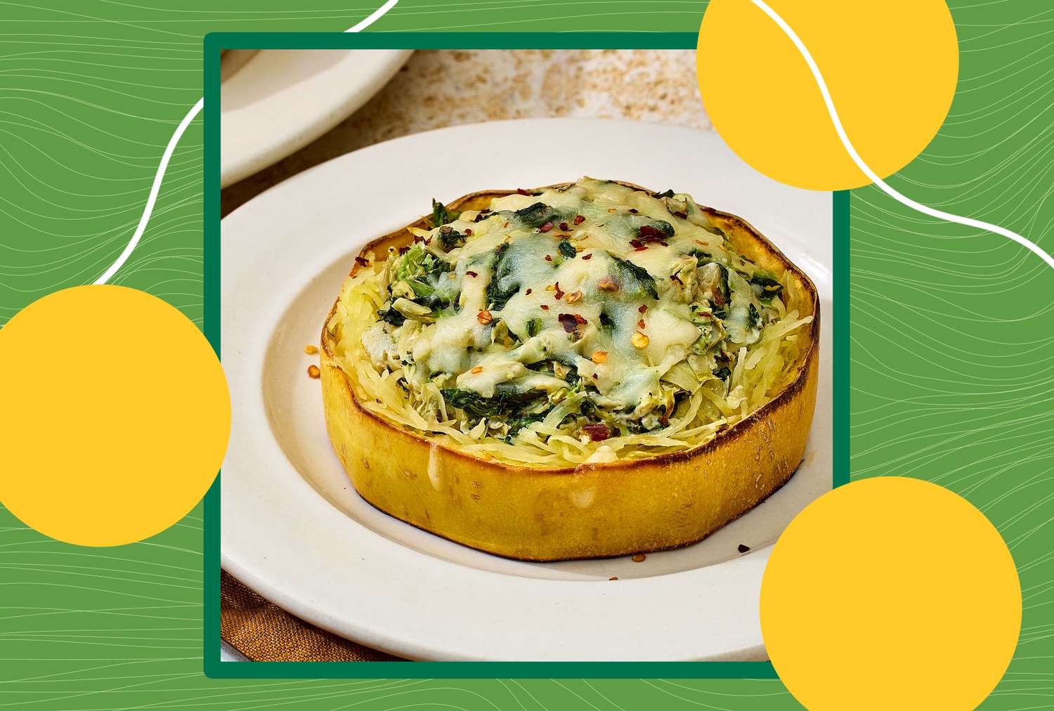 स्क्वॅशच्या लांब स्पॅगेटी सारखी स्ट्रँड तयार करण्यासाठी नेहमी वापरल्या जाणाऱ्या नेहमीच्या रोस्ट-आणि-स्क्रॅप पद्धतीऐवजी, या रेसिपीमध्ये, एकल-सर्व्ह आनंद घेण्यासाठी वैयक्तिक रिंग तयार केल्या जातात. स्क्वॅशचे गोल तुकडे करून बिया काढून टाकल्यानंतर, स्क्वॅश सुमारे 30 मिनिटे बेक केला जातो. सुरुवातीच्या भाजण्याच्या वेळेत तुम्ही पालक, आर्टिचोक, परमेसन आणि क्रीम चीज भरून तयार करता. पुढे, तुम्ही गोलाकारांच्या आतील भागाचे तुकडे करा, त्वचा अबाधित ठेवा, नंतर पालक-आटिचोक मिश्रण आणि थोडे मोझारेला चीज सह वर करा. चीज वितळण्यासाठी ओव्हनमध्ये द्रुत प्रवास केल्यानंतर, डिश आनंद घेण्यासाठी तयार आहे.