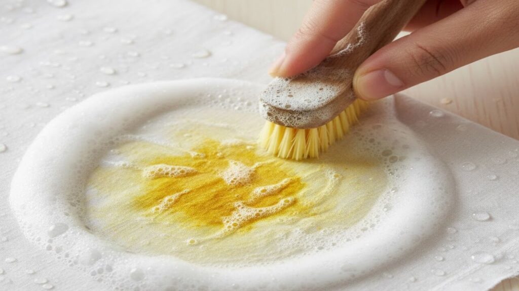 - डिटर्जंट लागू करा: एक लहान रक्कम घासणे द्रव कपडे धुण्याचे डिटर्जंट किंवा डिश साबण थेट डाग वर. जुन्या टूथब्रशने किंवा तुमच्या बोटांनी हळुवारपणे क्षेत्र स्वच्छ करा.