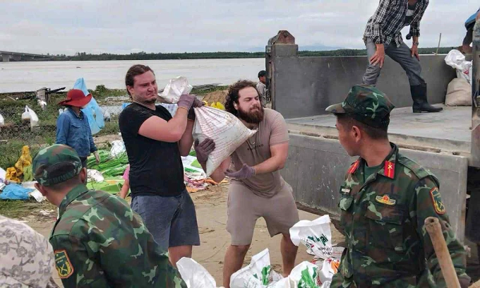 साशा खझात्स्की आणि मॅक्सवेल नुस्बौम यांनी 3 नोव्हेंबर 2025 रोजी सकाळी ड्यू नगिया कम्यून, डा नांग शहरातील एन लुओंग तटबंदी मजबूत करण्यात मदत केली. दोघांच्या व्हिडिओ सौजन्याने