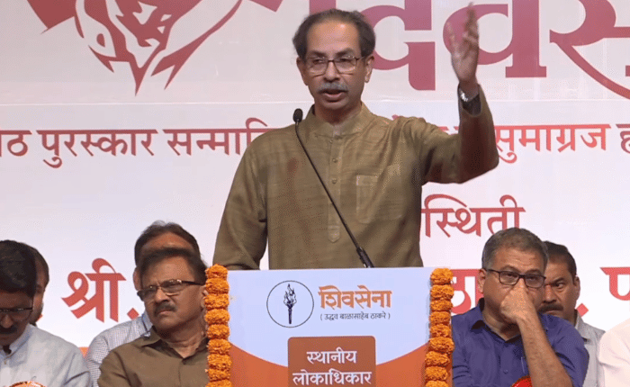 आज मराठी भाषा दिन आहे. नुसतं मराठीवर आक्रमण होतंय असं म्हणायचं नाही दिमागात साजरा केला पाहिजे. कोणाची हिमत आहे माझ्या मराठीला आडवं जाण्याची? येऊ द्या आडवं बघतो कोण आडवतो ते. कोणी येतं आणि आम्हाला हनुमान चालीसा शिकवतं? आमचं मारुती स्तोत्र कमी आहे का? “भीमरूपी महारुद्रा…” समर्थ रामदासांनी लिहिलेलं. किती ताकद आहे त्यात. हनुमान चालीसेला विरोध नाही. रामरक्षा आहे. भगवद्गीता आहे. पण पहिली भगवद्गीता ज्ञानेश्वरांनी वयाच्या सोळाव्या वर्षी ज्ञानेश्वरी लिहिली.