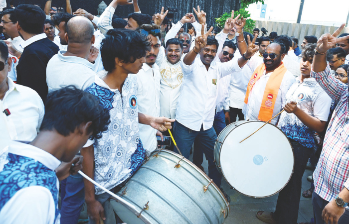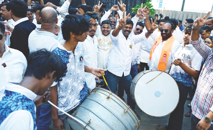पत्रकार परिषदेच्या निमित्ताने दक्षिण मुंबई भगवामय झाली होती. वरळीकडे जाणारे सर्व रस्ते शिवसेना व मनसेच्या भगव्या झेंडय़ांनी फुलून गेले होते. कार्यकर्त्यांचे जथे हातात भगवे झेंडे घेऊन आणि घोषणा देत वरळीच्या ब्ल्यू सी हॉटेलकडे येत होते. आवाज मराठीचा… मुंबईत चालणार फक्त ठाकरे ब्रँड… अशा घोषणा दिल्या जात होत्या.