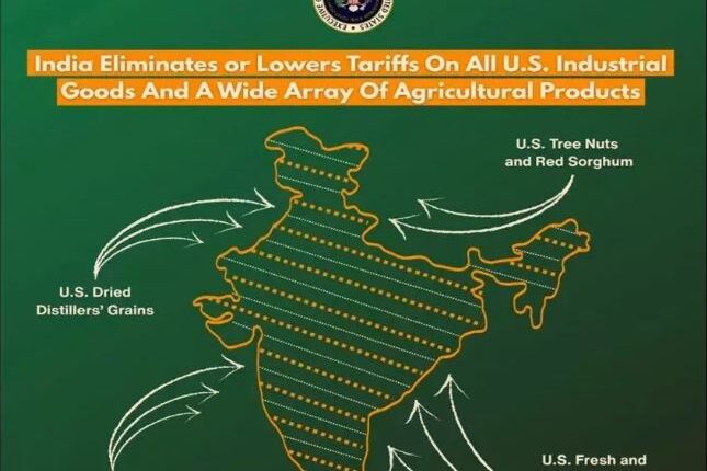 गेल्या आठवड्यात, यूएस आणि भारताने व्यापारावरील द्विपक्षीय अंतरिम कराराच्या फ्रेमवर्कचा तपशील जाहीर केल्यामुळे, यूएस व्यापार प्रतिनिधीच्या कार्यालयाने भारताच्या नकाशासह, सोशल मीडिया वेबसाइट X वर व्यापार कराराची माहिती पोस्ट केली.