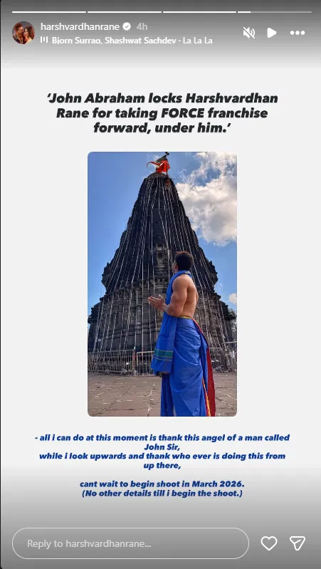 हर्षवर्धनने त्याच्या इंस्टाग्राम स्टोरीवर नाशिकमधील त्र्यंबकेश्वर मंदिरात आशीर्वाद घेत एक फोटो शेअर केला. त्याने लिहिले की जॉन अब्राहमने “फोर्स” फ्रँचायझी पुढे नेण्यासाठी त्याची निवड केली आहे. हर्षवर्धनने जॉन अब्राहम आणि देवाचे आभार मानले आणि तो शूटिंग सुरू होण्याची आतुरतेने वाट पाहत असल्याचे सांगितले. मार्च २०२६ मध्ये चित्रपटाचे शूटिंग सुरू होणार आहे.