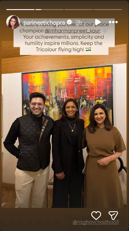 परिणीती चोप्राने आज तिच्या इंस्टाग्राम स्टोरीवर हरमनप्रीतसोबतचे काही फोटो शेअर केले आहेत. हे फोटो परिणीती आणि राघवच्या घरातील आहेत. फोटोंमध्ये परिणीती आणि राघव हरमनप्रीतसोबत दिसत आहेत आणि तिघेही कॅमेऱ्यासमोर पोज देत आहेत. हे फोटो शेअर करताना परिणीतीने हरमनप्रीतसाठी एक कॅप्शनही लिहिले. परिणीतीने लिहिले की, “आमच्या घरी स्वागत आहे, चॅम्पियन. तुमचे यश, तुमची साधेपणा आणि तुमची आंतरिक मानवता लाखो लोकांना प्रेरणा देते. तिरंग्याचा सन्मान वाढवत राहा.”