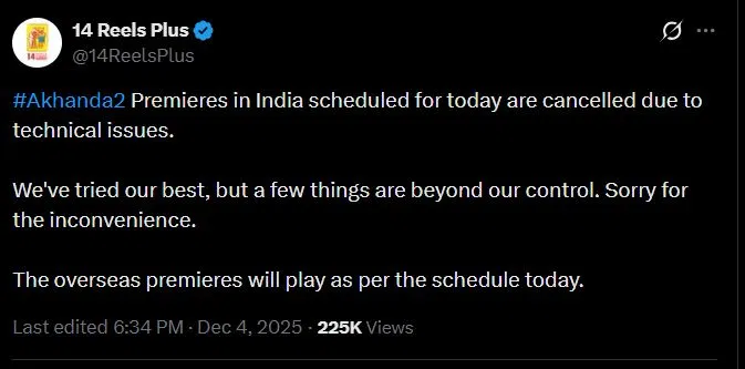 “अखंड २” चा प्रीमियर रद्द होणे हा चाहत्यांसाठी मोठा धक्का आहे. सकाळपासूनच १४ हून अधिक रील्सना त्यांच्या मागील प्रकल्पांशी संबंधित अडचणी येत असल्याच्या बातम्या येत आहेत. असे म्हटले जात आहे की इरोस इंटरनॅशनलच्या अस्पष्ट पेमेंट समस्यांमुळे या अडचणी येत आहेत.