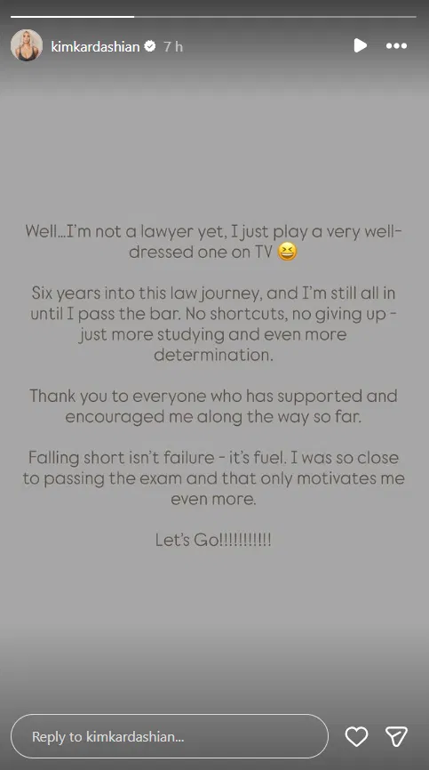 किम कार्दशियनने तिच्या इंस्टाग्राम स्टोरीवर एक नोट लिहिली. ती म्हणाली, “मी अजून वकील नाहीये, मी फक्त कपडे घालते आणि टीव्हीवर एक नाटक करते. मला या कायदेशीर प्रवासात सहा वर्षे झाली आहेत. बारची परीक्षा उत्तीर्ण होईपर्यंत मी पूर्णपणे वचनबद्ध आहे. कोणताही शॉर्टकट नाही, नोकरी सोडायची नाही, फक्त अधिक अभ्यास आणि अधिक दृढनिश्चय.”