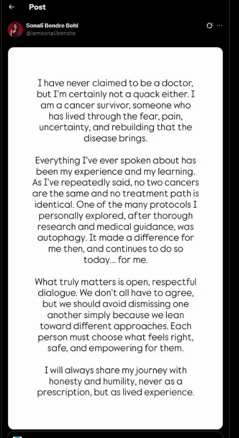 अभिनेत्रीने पुढे लिहिले, “मी जे काही सांगितले आहे ते माझे अनुभव आणि शिकणे आहे. मी वारंवार म्हटल्याप्रमाणे, कोणतेही दोन कर्करोग सारखे नसतात आणि कोणतीही उपचार पद्धत सारखी नसते. सखोल संशोधन आणि वैद्यकीय मार्गदर्शनानंतर, मी स्वतः शोधलेल्या अनेक प्रोटोकॉलपैकी एक म्हणजे ऑटोफॅगी. तेव्हा त्याने माझ्यासाठी फरक केला आणि आजही तो माझ्यासाठी प्रभावी आहे. खरोखर महत्त्वाचे म्हणजे खुले, आदरयुक्त संवाद. आपण सर्वांनी सहमत असण्याची गरज नाही, परंतु आपण वेगवेगळ्या उपचार पद्धतींकडे झुकतो म्हणून एकमेकांना नाकारणे टाळले पाहिजे. प्रत्येक व्यक्तीने योग्य, सुरक्षित आणि सक्षम वाटणारा पर्याय निवडला पाहिजे.”