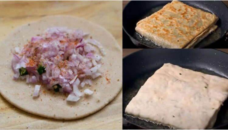 तिसरी पायरी- नाश्ता करण्यासाठी, कणकेचा एक मोठा गोळा घ्या आणि तो पातळ आणि मोठा करा. तुम्हाला रोटीच्या दुप्पट रक्कम आणावी लागेल. हलके तेल लावून वर कोरडे पीठ शिंपडा. आता त्यावर २ चमचे कांद्याचे सारण चांगले पसरवा. आता रोटीचे 2 भाग दुमडा आणि नंतर चौकोनी बनवा.